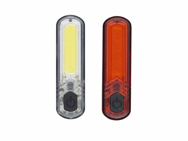 Genopladeligt lygtesæt fra ABUS med varierende lysintensitet. Hvert tryk gør lyset kraftigere og der slukkes ved at holde på knappen i 2 sekunder.